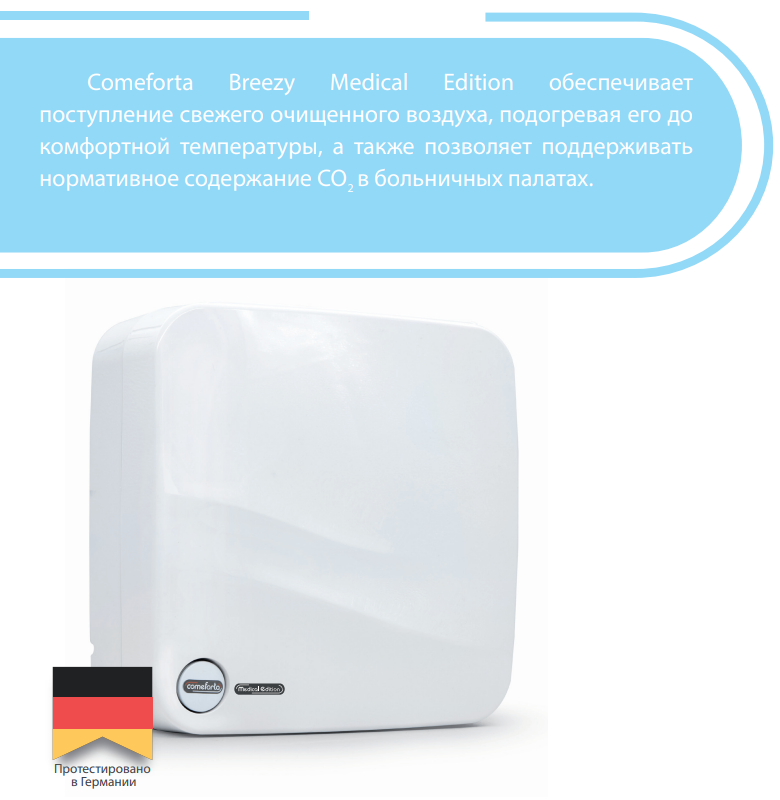 Тихий двигатель немецкого производства обеспечивает низкий уровень шума в 20 дБ, что полностью соответствует санитарным нормам, а значит Comeforta Breezy Medical Edition не будет создавать шумовых помех.